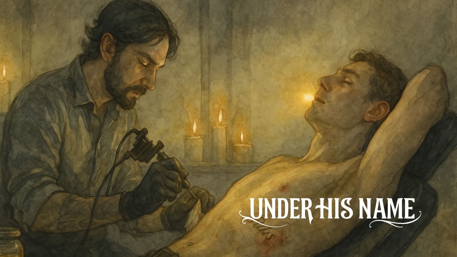 Under His Name is a gothic love story told through fifty-two sessions of ink and resurrection. It begins with grief and ends with transfiguration, charting the slow, luminous descent from body to myth. The marks change. The room changes. The world itself begins to listen.